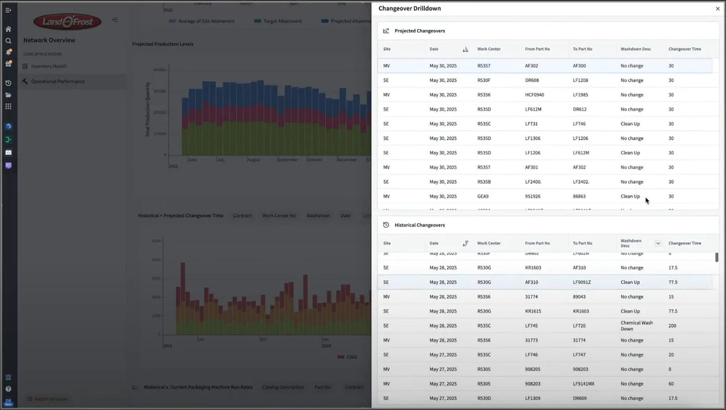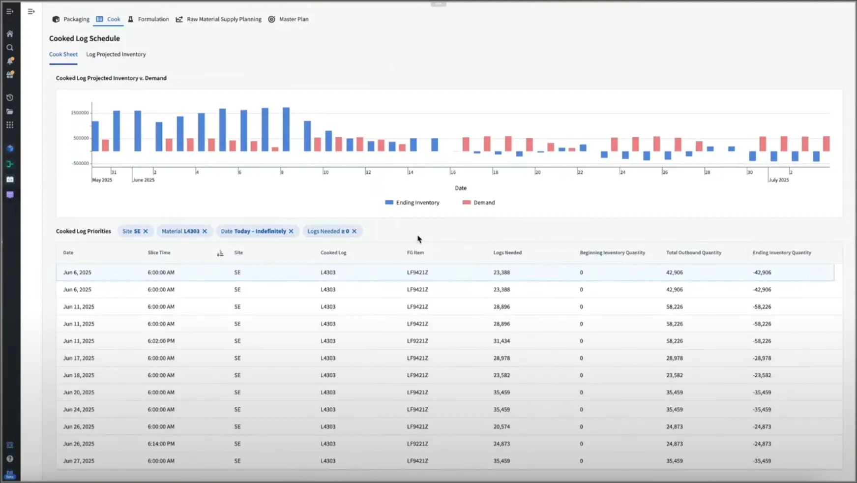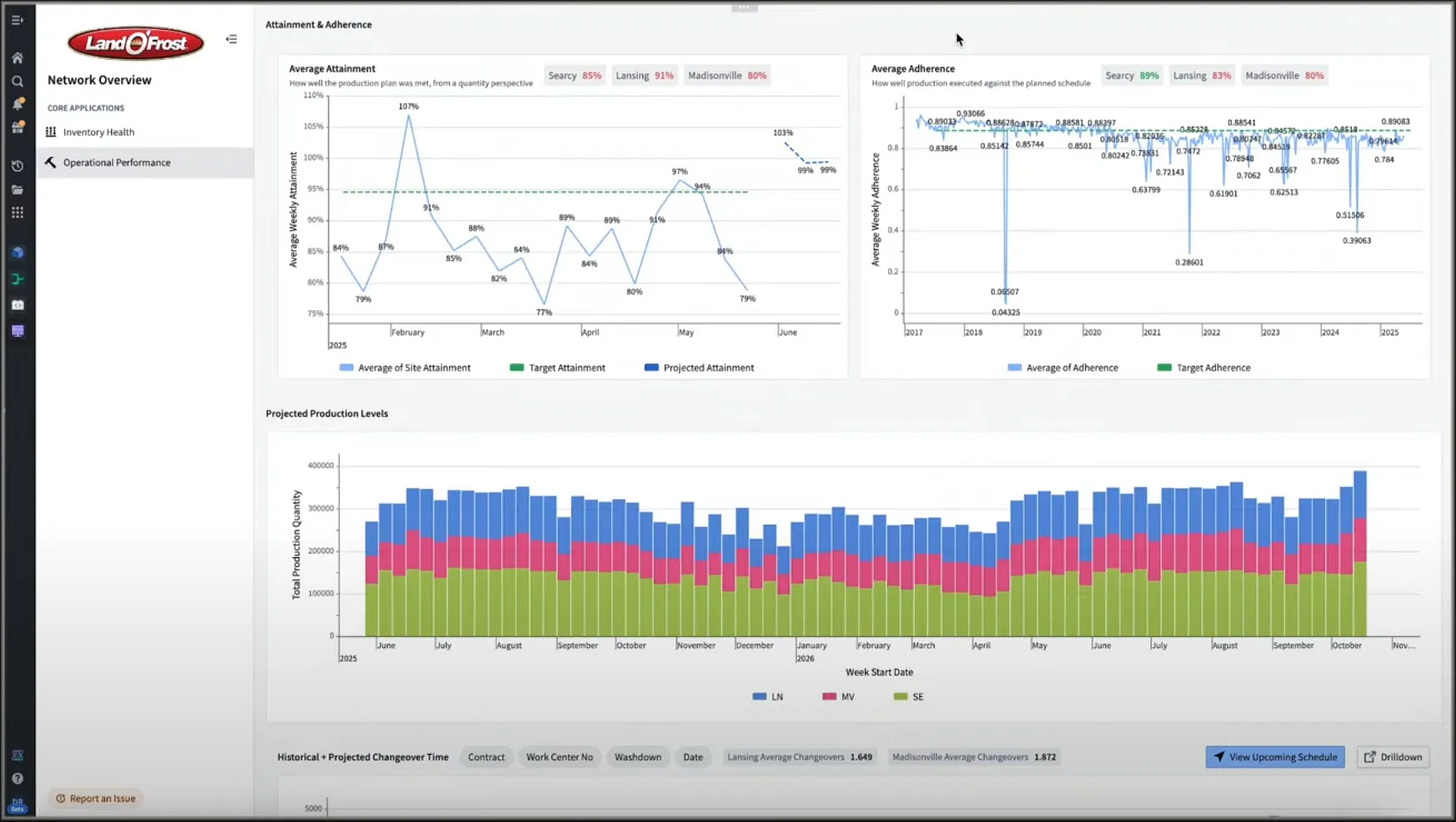 The master scheduling process allows them to generate production schedules up to 18 months in the future. Creating an annual operations program used to take about 40 hours, but now takes about 30 minutes. Optimization in the manufacturing plant focuses on reducing changeovers, and the dashboards they've implemented make it easy to see the reduction in changeovers.