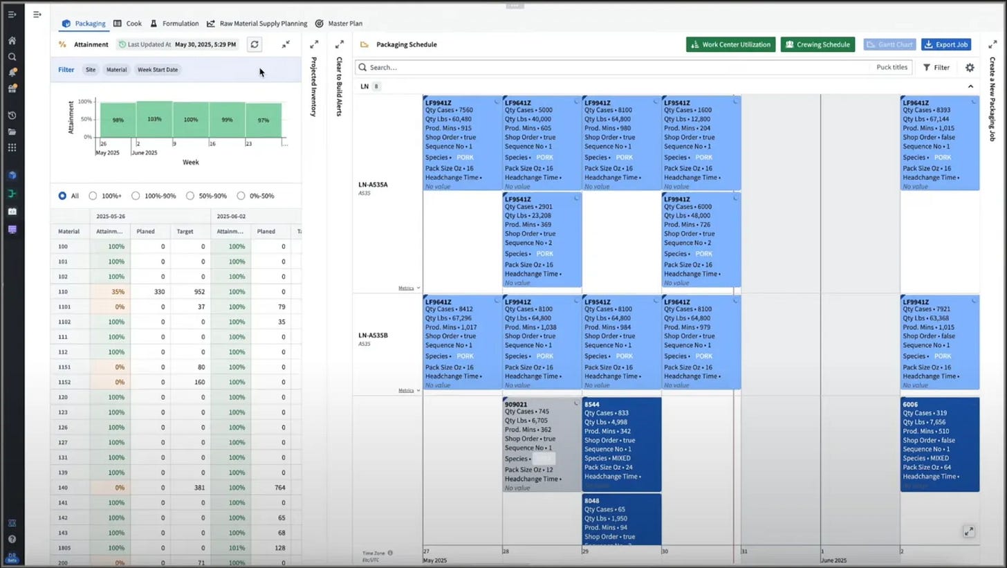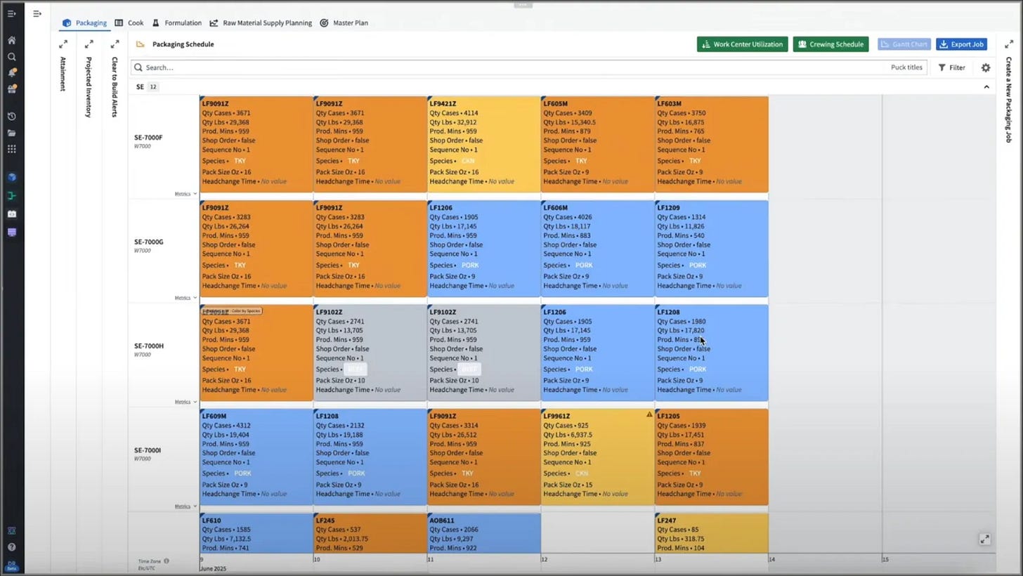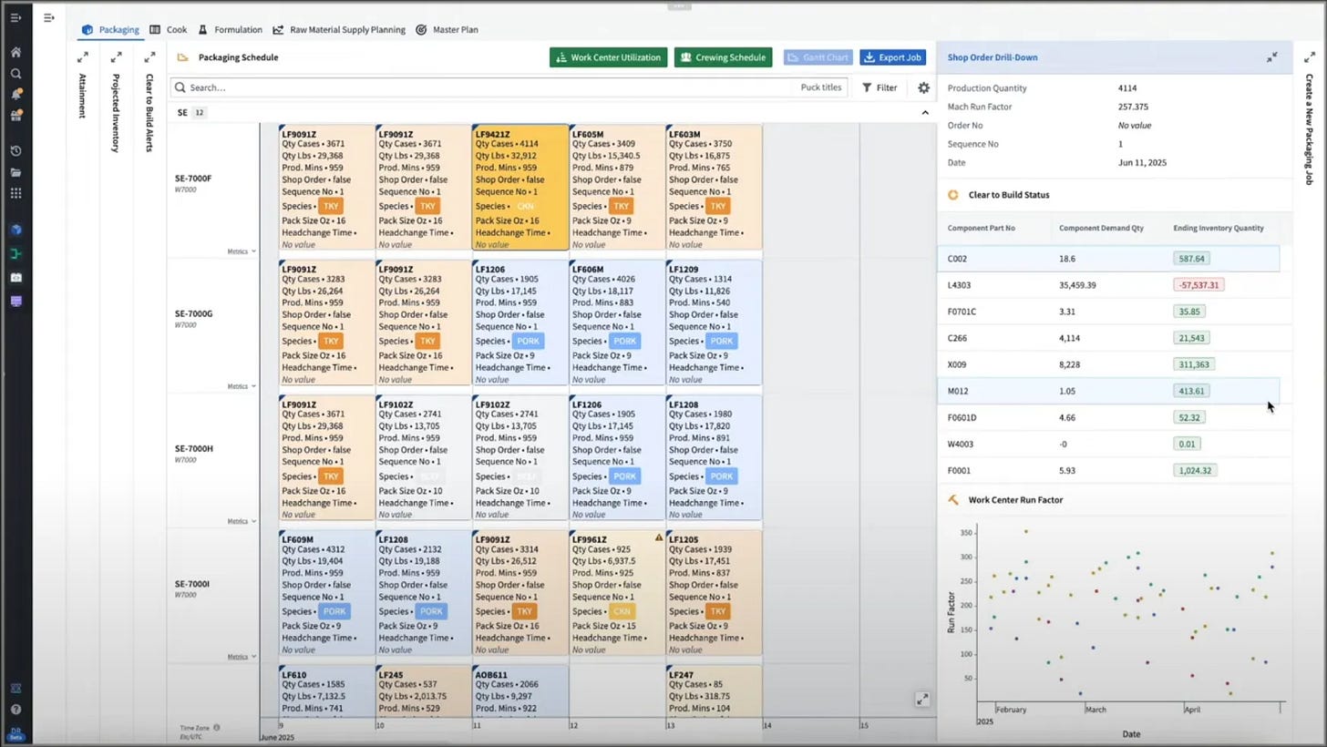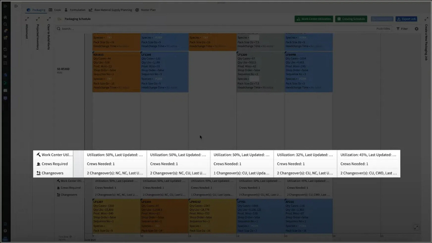By clicking on a specific inventory management unit, you can see the historical run rate of all the machines that produced that item in the last 90 days. When moving the "puck" to different lines, planners can choose the most efficient line based on historical data, which is more accurate than relying on knowledge that may be inaccurate. For example, if a particular ingredient is in red because it is low in stock, you can get a full picture of when it will be cooked and available to support production.