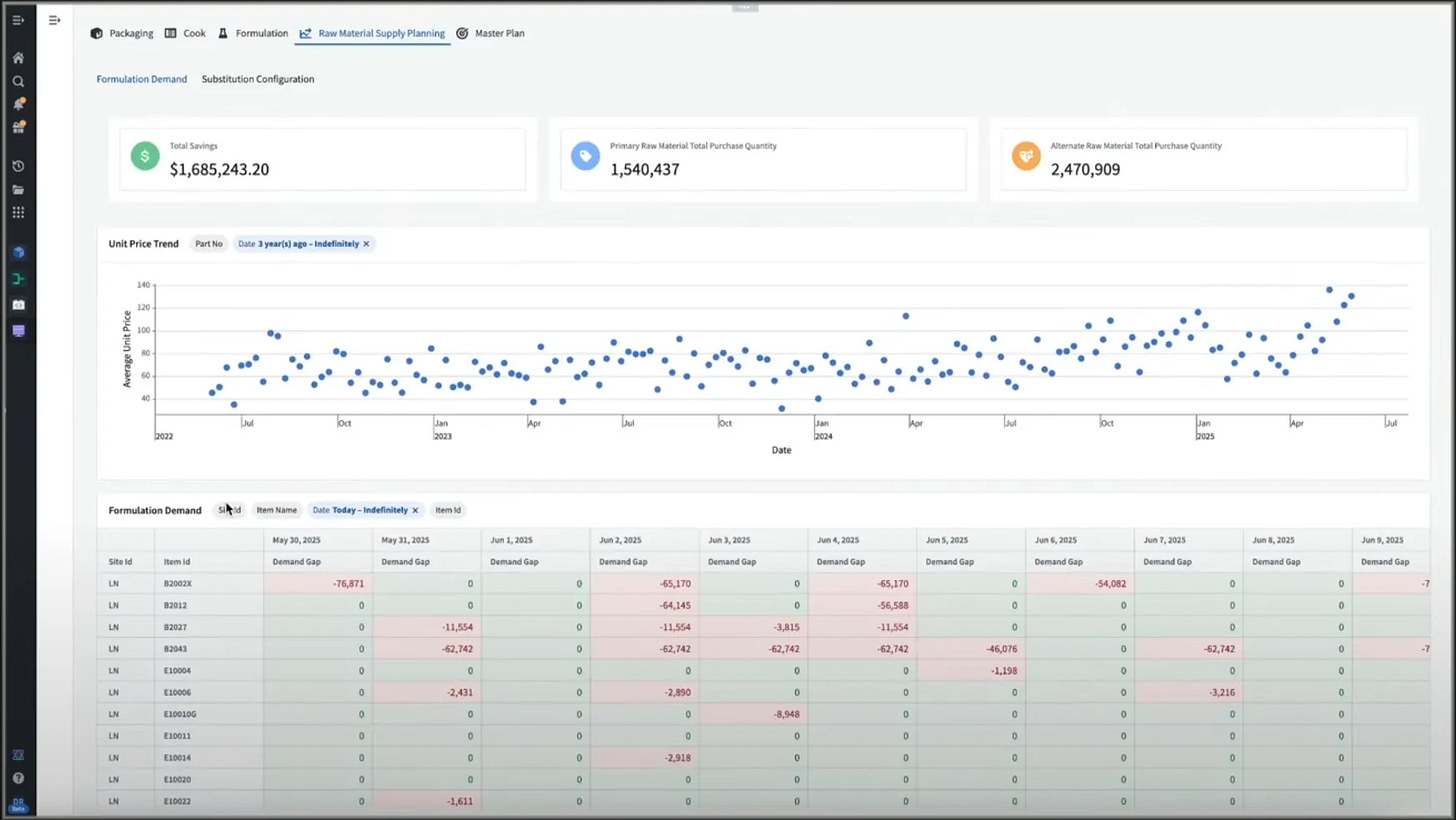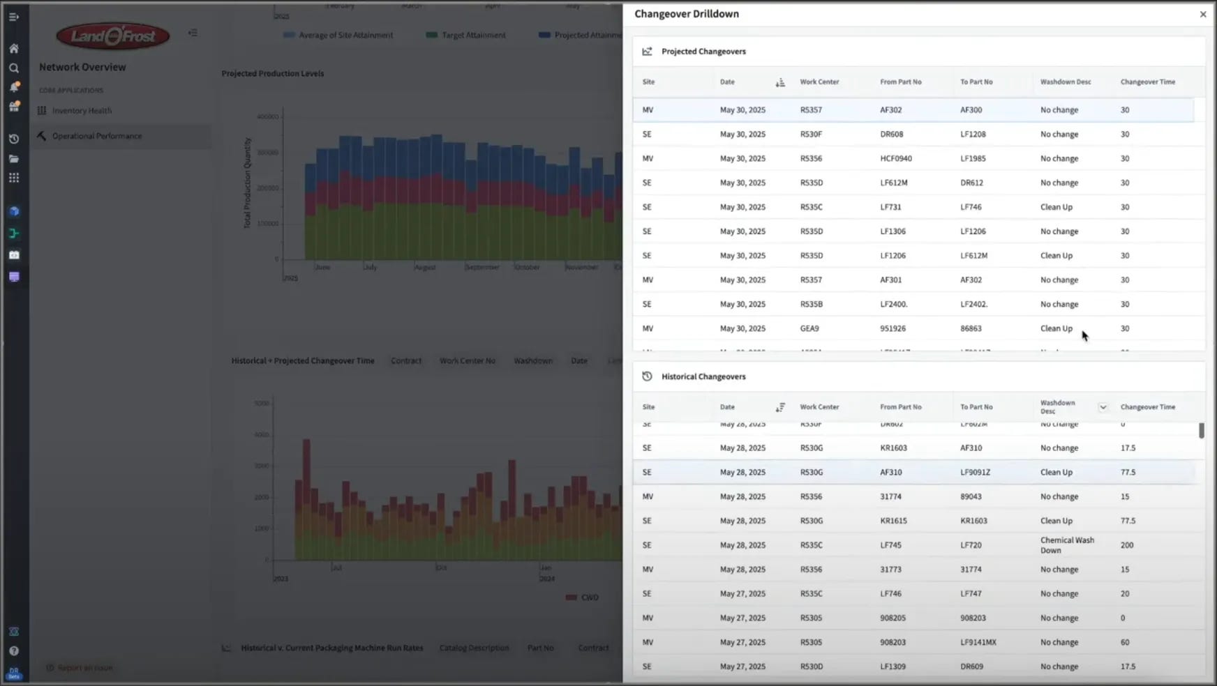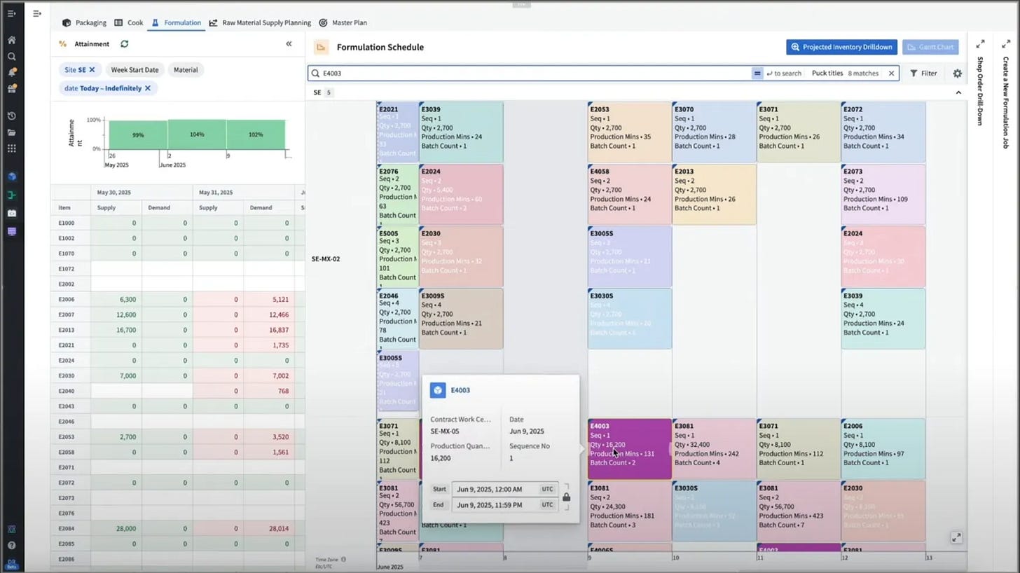By clicking on a specific inventory management unit, you can see the historical run rate of all the machines that produced that item in the last 90 days. When moving the "puck" to different lines, planners can choose the most efficient line based on historical data, which is more accurate than relying on knowledge that may be inaccurate. For example, if a particular ingredient is in red because it is low in stock, you can get a full picture of when it will be cooked and available to support production.
